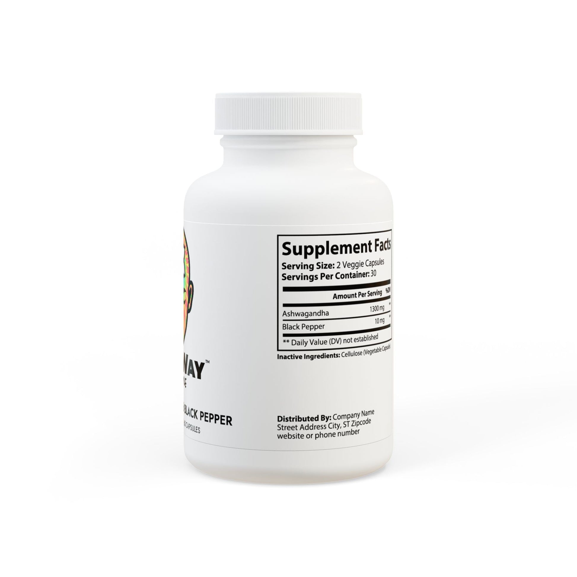 Ingredients: Ashwagandha, Black Pepper. Inactive Ingredients: Cellulose (Vegetable Capsule).